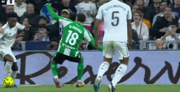 从慢镜头来看,贝林厄姆试图解围但右脚踢在巴尔特拉左脚上,随后右脚连球带人一起踢。